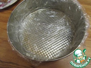 Разъёмную форму D= 20 см. застелить пищевой пленкой. Торт будем собирать в такой форме, а можно в широкой стеклянной форме или квадратной.