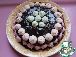 После пропитки торт полить глазурью. В сотейник вылить молоко, добавить сахар, сливочное масло, какао-порошок и все хорошо прогреть на малом огне до растворения сахара. Остудить глазурь до комнатной температуры. Залить торт глазурью. И поставить в холодильник для застывания. Украсить на свое усмотрение. Я использовала безе маленькие.