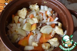 На дно керамического горшка выложить 1/4 часть сливочного масла, 1/4 часть мяса, 1/4 часть лука и моркови.