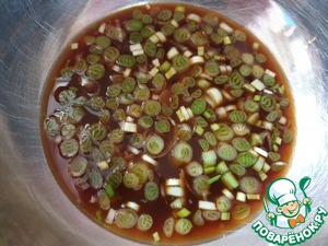 В миску отжать натертый имбирь (жмых выбросить), вылить вино и соевый соус (50мл), положить лук.
