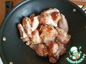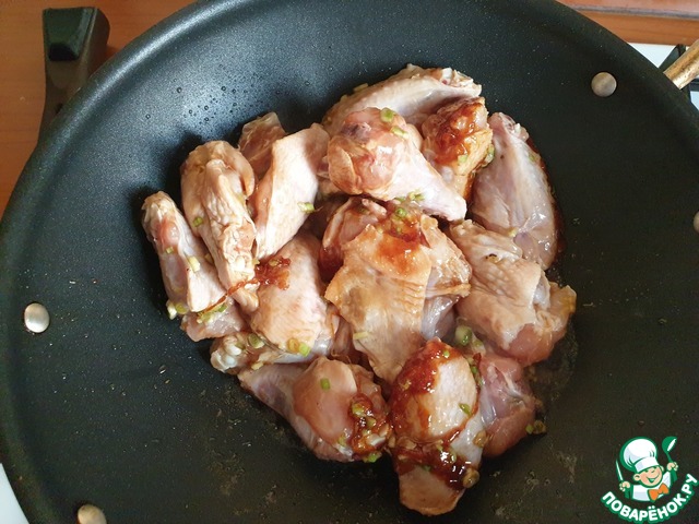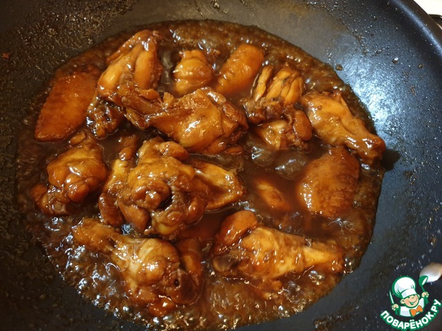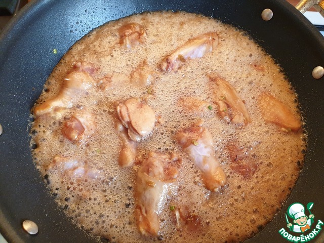 Крылышки добавить в вок. Перемешать таким образом, чтобы все крылья оказались в карамели. Карамель может начать кусковаться, на это не обращать внимания.