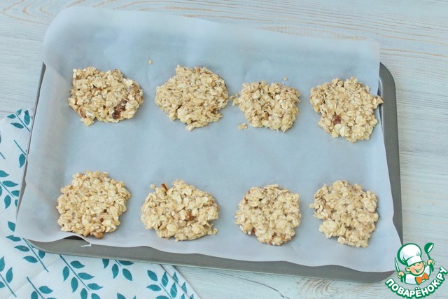 На противень, застеленный пергаментной бумагой, выкладываем тесто. Формируем печенье. У меня получилось 9 штук. Пергамент можно предварительно смазать растительным маслом.