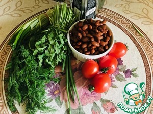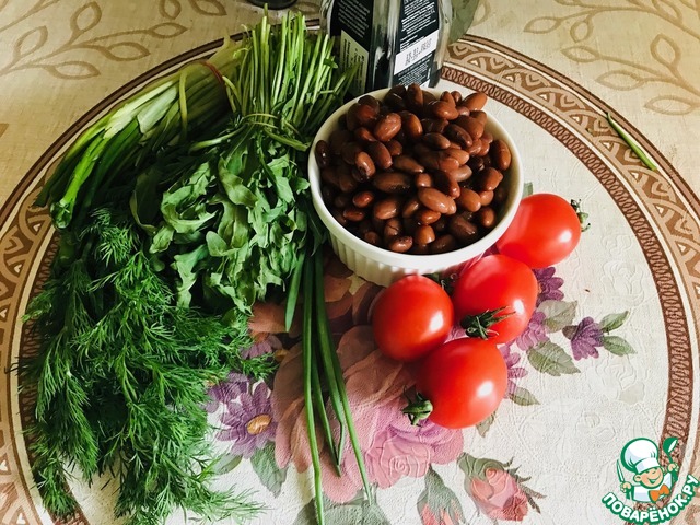 • Вот наш скромный набор продуктов. Фасоль заранее сварить, помидоры и зелень помыть.