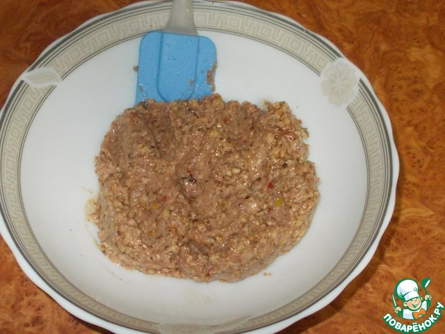 Подготавливаем фарш лявянги. Для этого смешать лук, орехи, 2 ст. л. туршу (наршараба или ткемали), 1 ст. л. растительного масла.