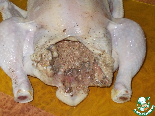 Теперь фаршируем курицу подготовленной массой из орехов и лука.