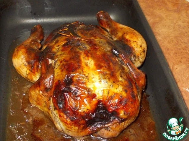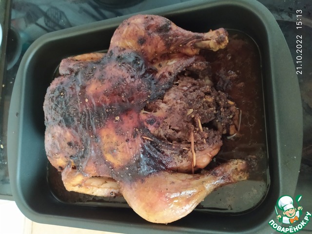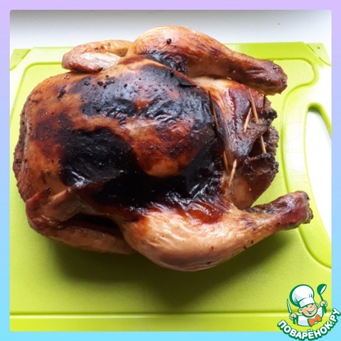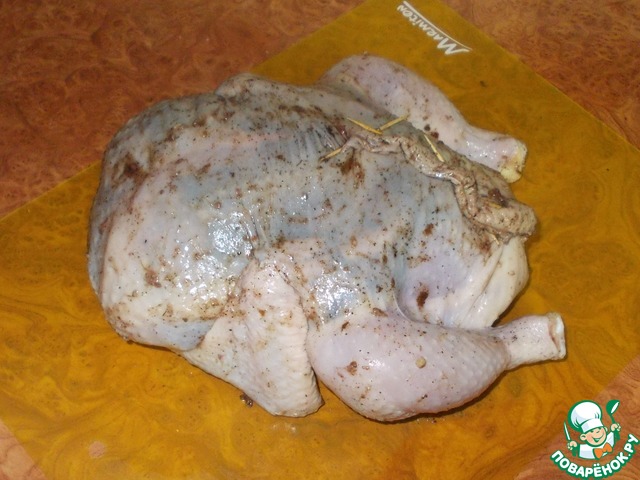 Готовить курицу можно сразу, но если располагаете временем, то лучше дайте курице пропитаться соусом и начинкой! Я обычно ставлю подготовленную тушку на ночь в холодильник.
