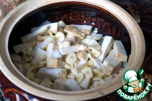 Дно обливного горшка выстелить курдюком, всыпать лук, сельдерей, чеснок, немного посолить.