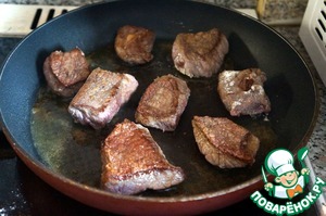 Муку смешать с солью и черным перцем, обваливать в ней куски мяса и обжаривать в сковороде на топленом масле.