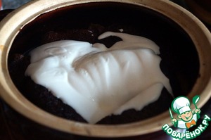 Вынуть горшок, положить шесть ложек деревенской сметаны, отправить в духовку на ту же температуру еще на 15 минут.