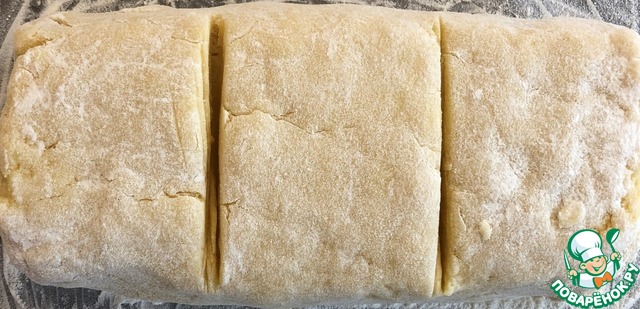 Перенесём тесто на присыпанный мукой силиконовый коврик и разделим на 3 равные части
