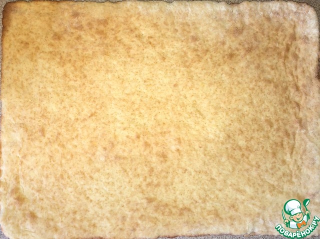 • 1/3 часть теста раскатать, периодически припудривая мукой, по размеру противня. Выпекать на присыпанном мукой противне при темп. 200 град. 8 мин., до золотистого цвета. Переносить тесто на противень довольно трудно - оно тонкое (2 мм.) и легко рвётся. Я делаю так: коврик кладу на большую разделочную доску, раскатанное тесто посыпаю мукой, закрываю противнем и всю конструкцию переворачиваю - просто и легко! Убираю доску, снимаю коврик и, осторожно надавливая на тесто, подправляю его - подгоняю по размеру и форме противня, где надо - растяну, где надо - подсожму. Пеку я на втором уровне снизу.