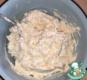 • Теперь займёмся тестом. В миске взбить масло с сахаром и яичными желтками, добавить сметану, снова взбить. Сахар должен почти полностью раствориться. Всыпаем понемногу муку, мешая сначала миксером на низких оборотах, потом ложкой, а в конце иногда и руками. С последней или предпоследней порцией муки добавляю соду и разрыхлитель ( соду я никогда не гашу, если в тесто входит что-то кисломолочное, так тесто получается пышнее). Тесто у нас довольно липкое.