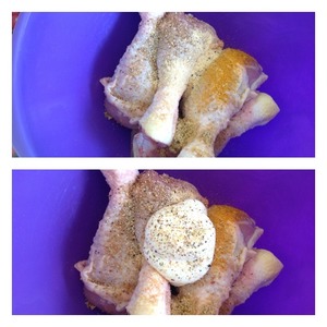 К куриным голеням добавить все специи и майонез (можно заменить на сметану). Тщательно перемешать и оставить мариноваться курочку минимум на час.