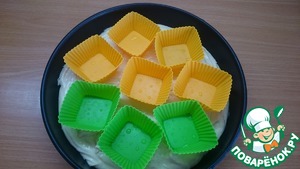 А теперь самое интересное. Силиконовые формочки ополаскиваем холодной водой, отряхиваем и выкладываем на тесто. Нажимаем совсем чуть-чуть, погружать в тесто не нужно, если "ямки" нужны неглубокие.