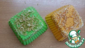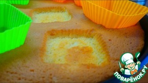 Проверяем бисквит на готовность зубочисткой, вытаскиваем и ставим на мокрое полотенце (чтобы легче было вытаскивать пирог из формы). Даем пирогу немного остыть и вытаскиваем силиконовые формочки.