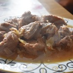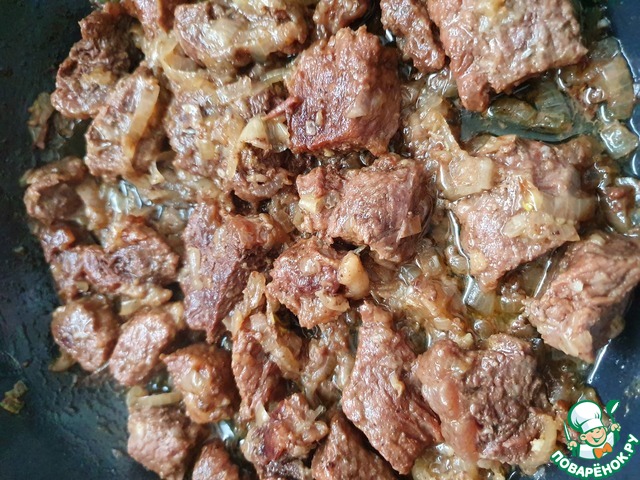 Говядину нарезать средними кусочками. Выложить в сковороду или кастрюлю с толстым дном.