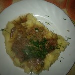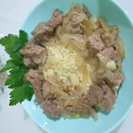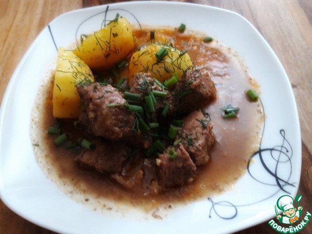 Готовое мясо подавать с любимым гарниром, посыпав мелконарубленной свежей зеленью.