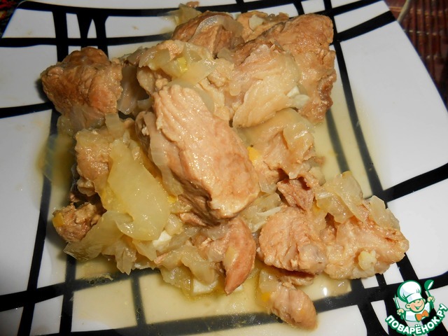 Лук нарезать полукольцами и выложить сверху на мясо.
