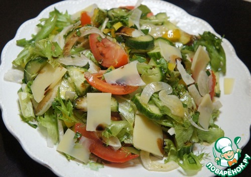 Выложить на плоскую тарелку, посыпать хлопьями пармезана и сбрызнуть бальзамическим соус-кремом (это по желанию и по возможности).