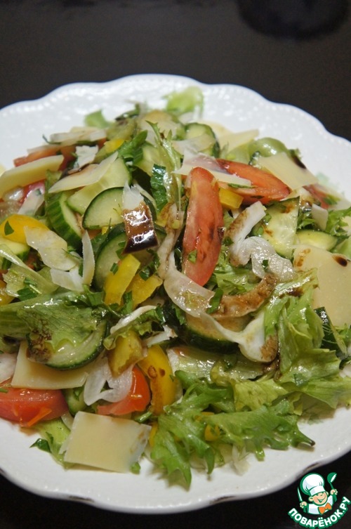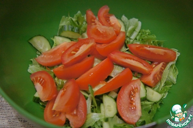 Салат посолить, полить заправкой и аккуратно перемешать.
