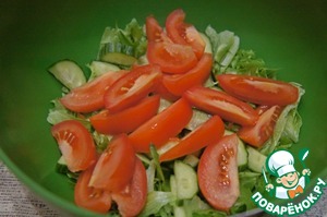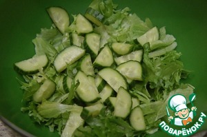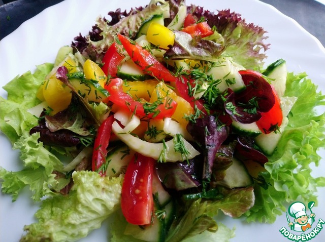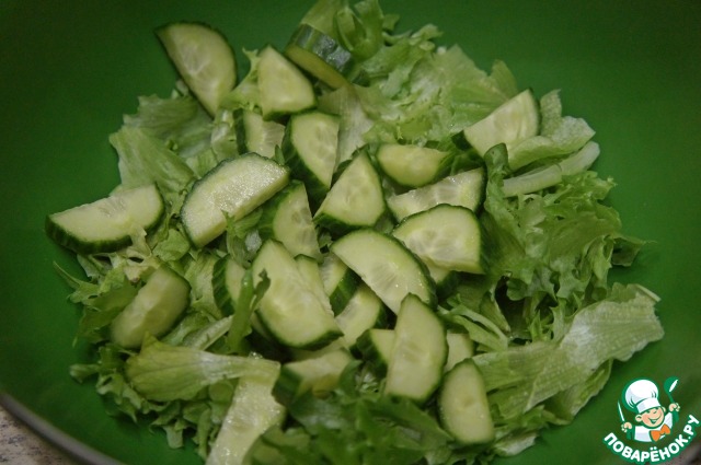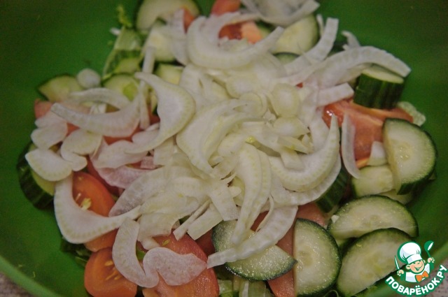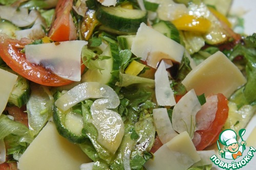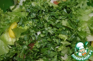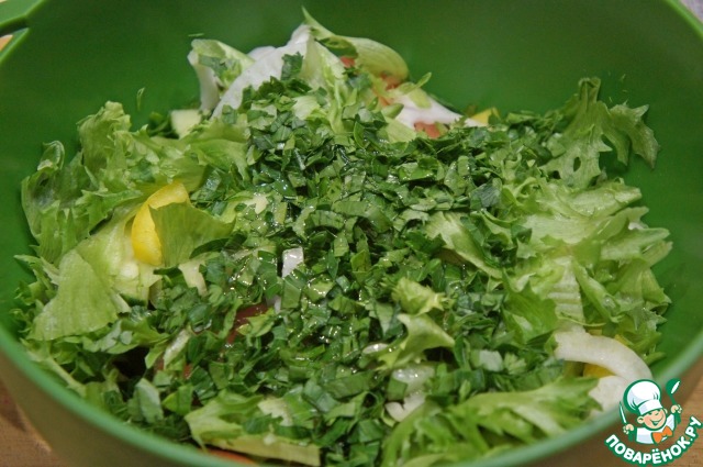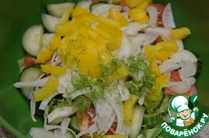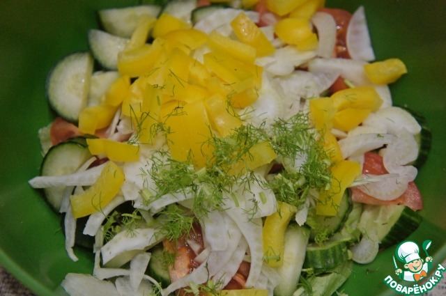 Зелень фенхеля мелко нарезать в салат. Ее немного, но не пренебрегайте ею, очень она ароматная.