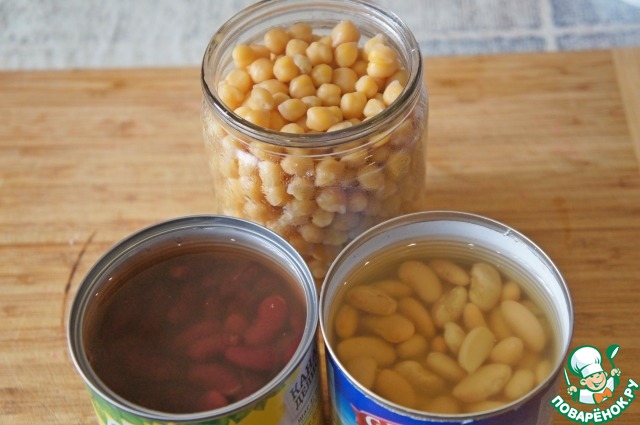 Поскольку консервированного гороха нут я никогда в жизни в магазинах Архангельска не видела, я с вечера замочила сухой нут и утром отварила его. Взяла 0,5-литровую банку вареного нута.