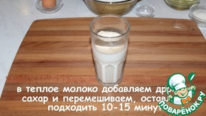 В теплое молоко добавляем дрожжи и сахар, перемешиваем. Оставляем подходить 10-15 минут.