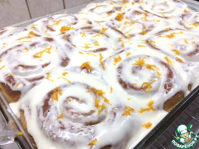 Смазываем еще теплые булочки приготовленной глазурью, по желанию посыпаем апельсиновой цедрой -