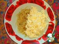Лук нарезать полукольцами и обжарить на растительном масле до золотистого цвета. Смешать с натертым на крупной терке плавленым сыром. |