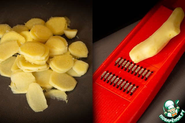 А те, у кого есть достаточно острый нож - режут имбирь максимально тонкими круглыми пластами. -