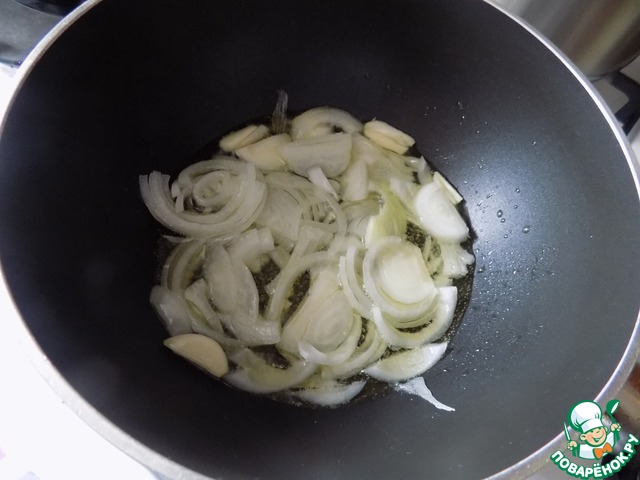 Нужно взять высокую посуду с толстым дном: вок, сотейник или, что у вас есть подходящее для приготовления этой гречки. Я возьму сотейник-кастрюлю. Греем в нём масло. В это блюдо я использую подсолнечное масло холодного отжима, можете использовать любое по вашему вкусу. Греем масло и выкладываем чесночные дольки, порезанные пополам. Держим чеснок в масле с минуту, чтобы он отдал свой аромат ему и убираем, выкладываем лук. Я порезала его тонкими полукольцами.