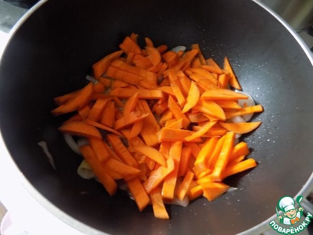 Когда лук станет золотистым и мягким, выкладываем морковь, порезанную брусочками, как режете её для плова. Немного обжариваем её до мягкости.