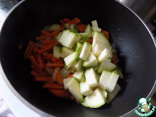 Обжариваем ещё немного, перемешивая и наливаем горячей воды. Солим по вкусу и варим минут 15.