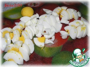 Яйца сварить вкрутую. Оставить для декора 1 желток, остальные яйца порезать довольно крупно.