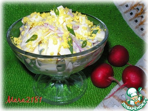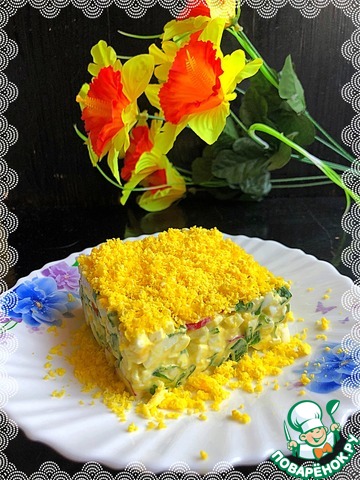 Какой получился яркий, весенний, бархатистый, солнечный, свежий салатик! А зелёные листики салата как будто недавно пробились из-под редисочки!
