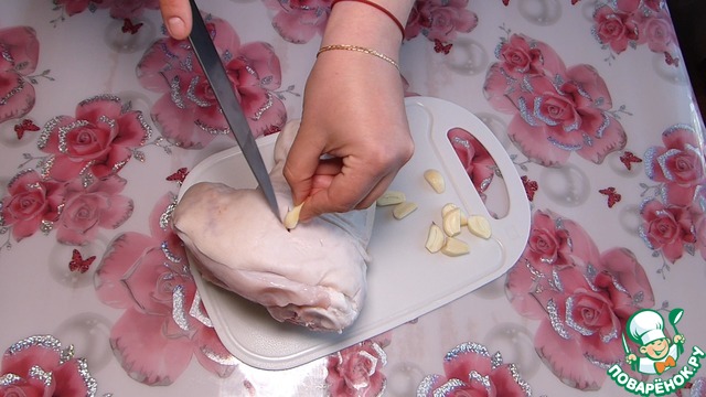 Делаем надрезы в глубину на рульки и шпигуем ее чесноком. -