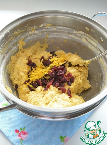 Вилкой замесите тесто, оно довольно липкое, добавьте клюкву и натертую цедру лимона. Влейте растопленное сливочное масло и хорошо вымесите тесто.