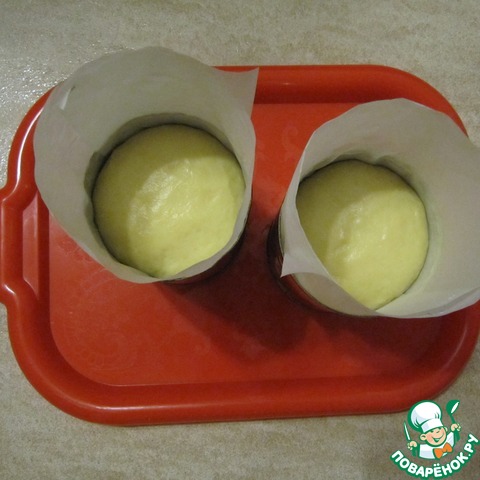 Для выпечки использую 2 жестяные формы (из-под консервированных персиков) высотой 18 см, диаметром 10 см. Дно и бока прокладываю бумагой для выпечки. Формы заполнять на 1/3 высоты, в моем случае - на половину, так как высота форм значительно увеличена бумагой.