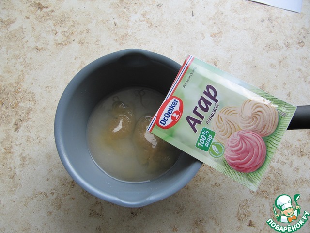 В антипригарном ковшике соединить воду, мелко кристаллический сахар 150 г, агар Dr. Oetker, перемешать, довести до кипения.