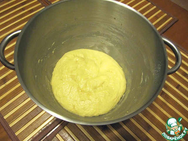 300 г просеянной муки высыпать в чашу тестомеса (ХП), влить молочно-дрожжевую смесь, яйца, примерно 50 г сахара и замесить тесто насадкой крюк в течении 5 минут на средних оборотах. Накрыть тесто пленкой и оставить тесто на 30 минут в теплом месте. По истечении времени снова вымесить тесто в течении 15 минут, добавляя в процессе вымешивания оставшийся мелко кристаллический сахар, ванильный сахар, соль, подтаявшее сливочное масло кусочками. Тесто должно быть гладким, хорошо отставать от стенок посуды, но быть очень мягким. В итоге всего муки потребовалось около 420-450 г. При ручном замешивании возможно потребуется скребок, но тесто мукой сверх указанного количества не забивать!