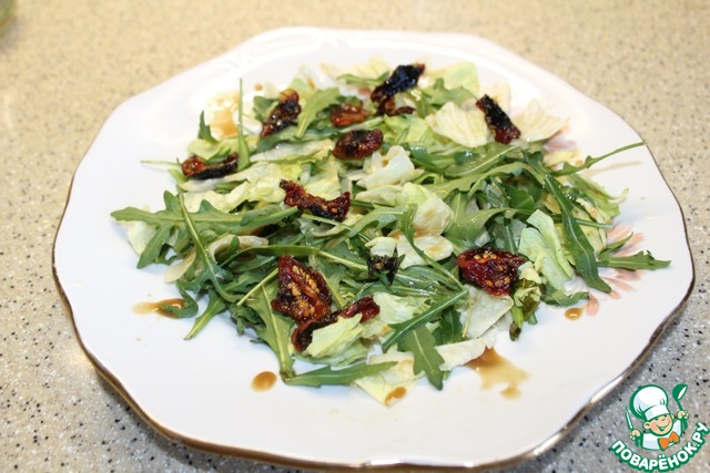 На блюдо выложим крупно порванные листья салата айсберг и листья рукколы, вяленые томаты, сбрызнем небольшим количеством заправки.