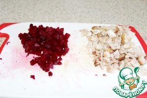 Нарежем свеклу маленькими кубиками, а курицу - произвольно.