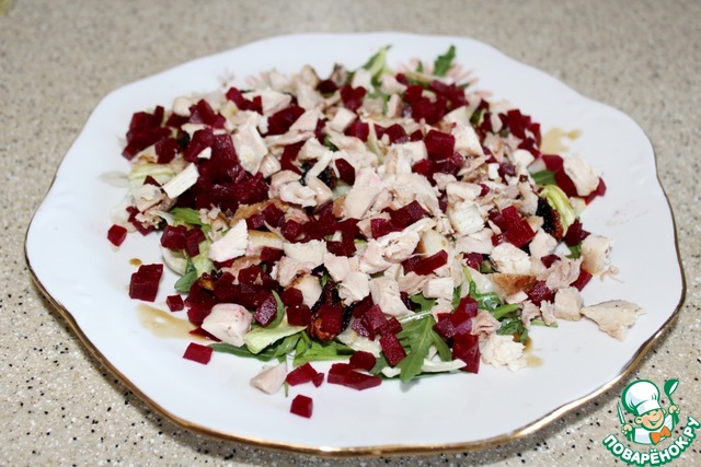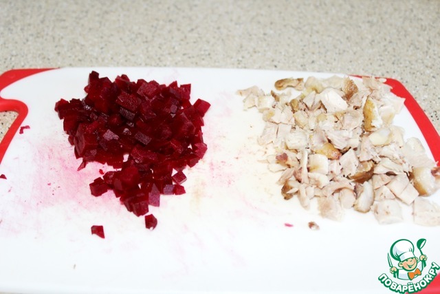Поверх выложенного ранее распределим кубики свеклы и курицу.