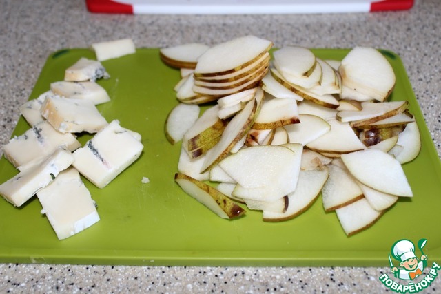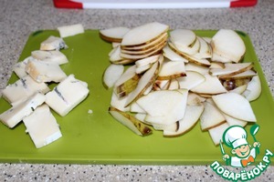 Сыр и грушу нарежем небольшими тонкими пластинами.