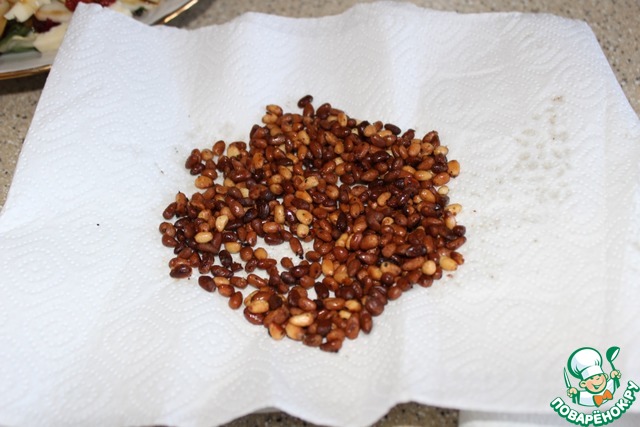 В этой же сковороде после бекона (жир не убираем) обжариваем кедровые орешки. Обсушиваем на бумажном полотенце. Грешна, некоторые орешки пережарила.
