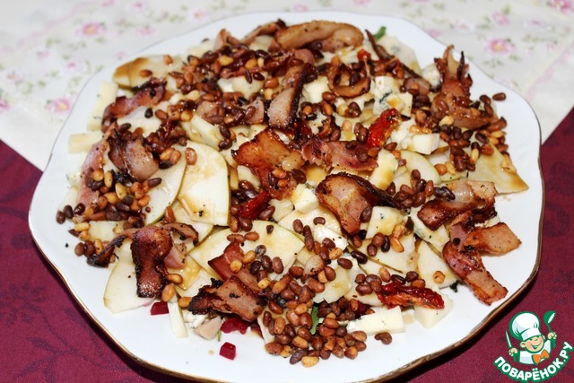 Сверху салат посыпаем орешками и беконом, поливаем заправкой. Заправку советую не использовать всю, а подать остатки отдельно, чтобы желающие могли добавить по своему вкусу.
