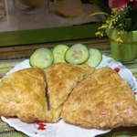 На пергаменте формируем из теста круг высотой примерно 1,5 см. Разрезаем на 8 секторов. Смазываем яйцом. Переносим на противень и запекаем 10 - 15 минут при 180 градусах.