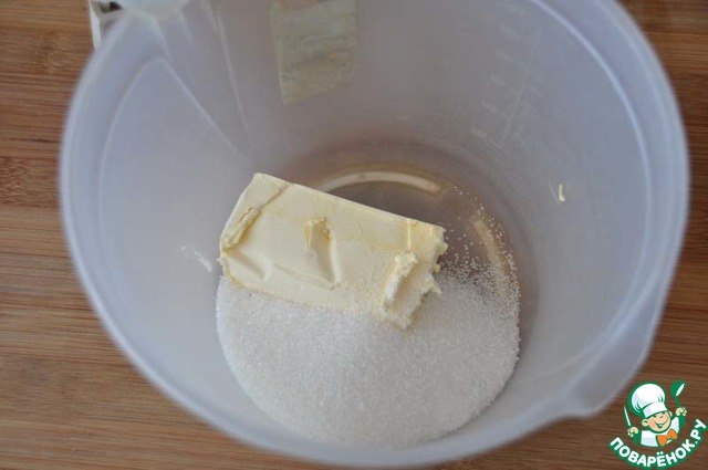 Берём сливочное масло (или маргарин) комнатной температуры, соединяем с сахаром и взбиваем миксером до однородного состояния.