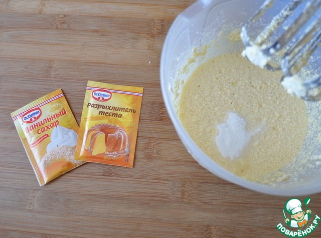 Добавляем ванильный сахар и разрыхлитель. У меня ТМ Dr.Oetker.