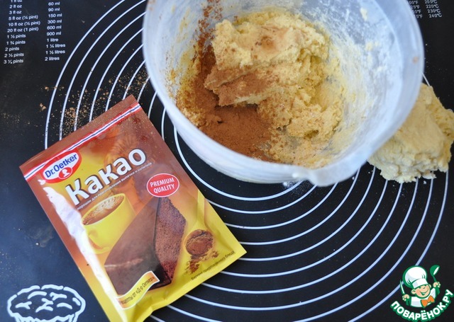 Делим тесто пополам и в одну часть добавляем какао-порошок, у меня ТМ Dr.Oetker.